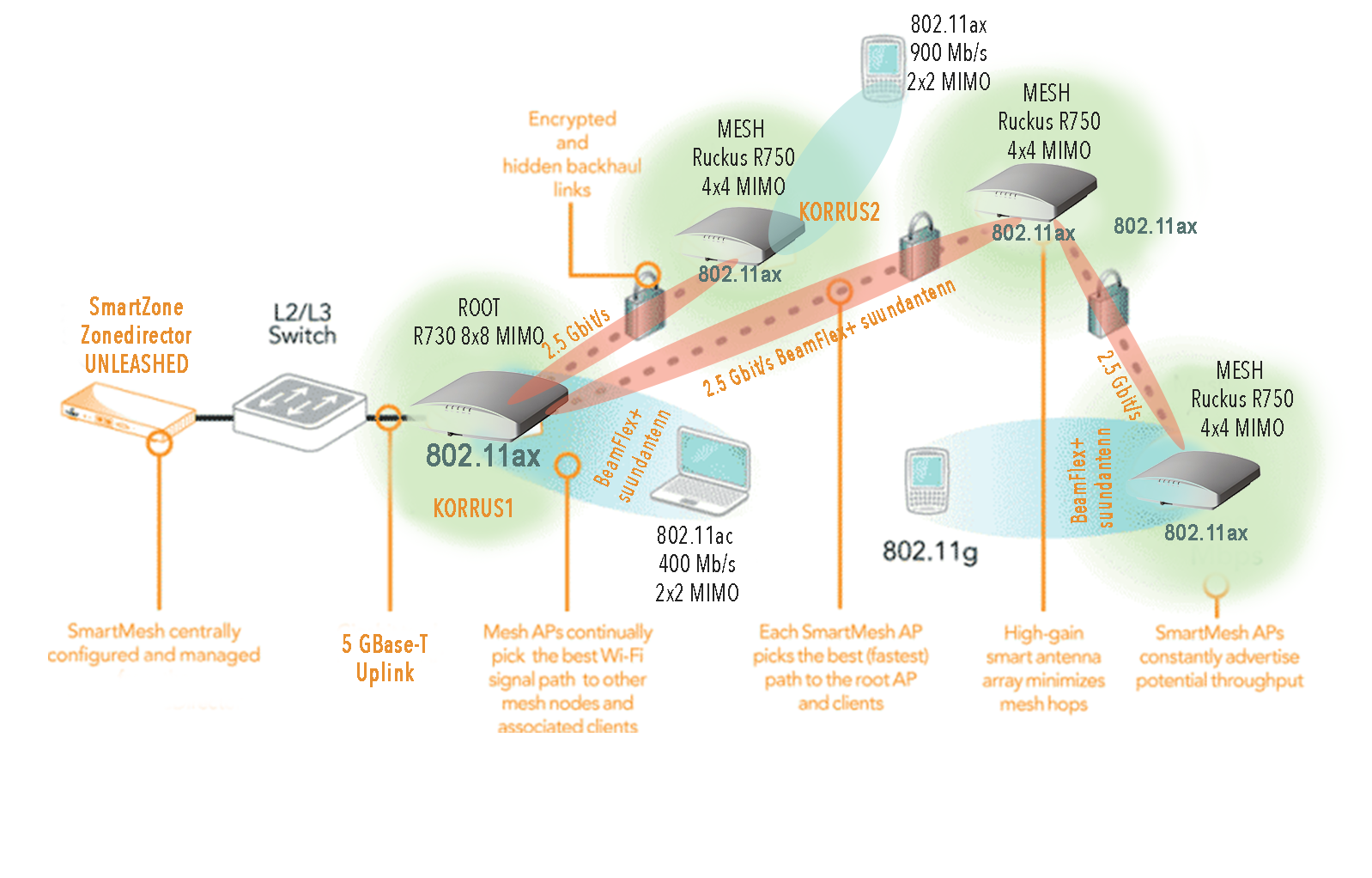 For example, if you have 9 R730, R750 802.11ax APs in the network, you can also connect 6 of them via the air. If the signals are good, the network bandwidth will be in the range of 5-10 Gb / s, which is already sufficient communication capacity for client devices that associate with the network with older Wi-Fi standards. So only 3 cables need to be routed and a small switch is needed, the rest of the AP needs to be connected to the mains.