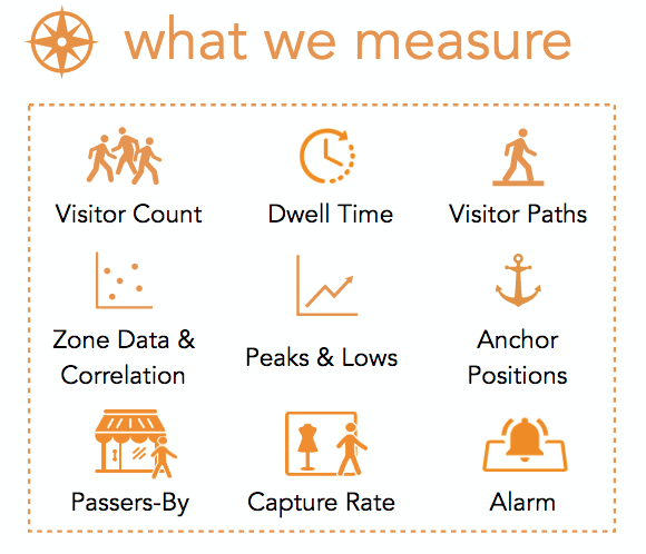 Mida me mõõdame ? Poode huvitab väga, milline on külaliste arv, kui kaua viibitakse keskuses, millistes poe osades konkreetselt käidi, millised on inimeste liikumiste trajektoorid. Linnaruumis või õhistranspordis on väga olulised inimeste liikumise trajektoorid ja ka ajad, millal ühte või teist ressurssi kasutati.