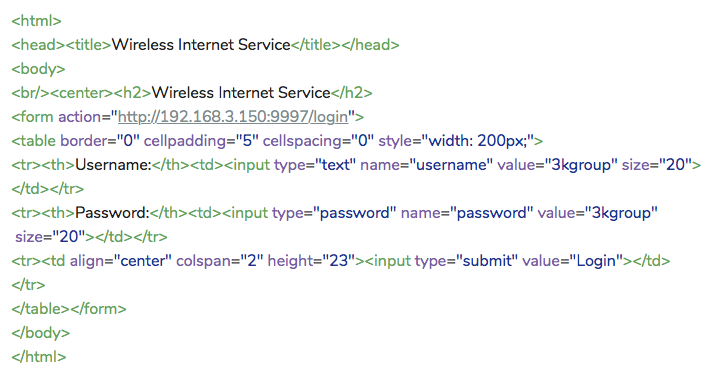 Kui kasutaja võrku läheb käivitatakse skript ja pärast nupu vajutamist avatakse antud kliendile wi-fi teenus. Järgnevas näites on eraldi div plokiga kasutajanimi ja parool ära peidetud, seega peab kasutaja ainult tingimustega nõustuma.