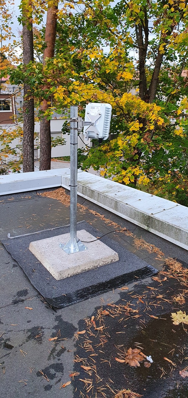 Wi-Fi seadmete paigaldusel hoonete külge on tihti mureks fassaadi terviklikkuse säilitamine. Pakume näidet, millega saab umbes meetrise toruga masti püsti lamekatusele ilma pinda kahjustamata, kivist aluse kaal on umbes 40kg, niipalju peab suutma katus kanda.