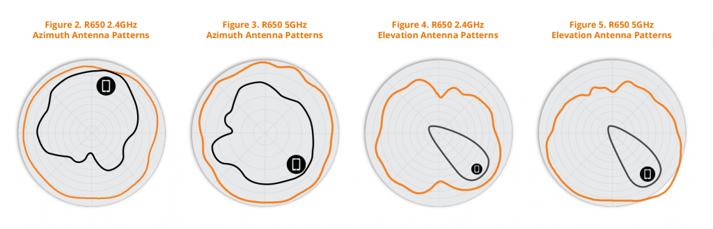 Vaatame vahelduseks uusima wi-fi 6 802.11ax Ruckus ZoneFlex R650 BeamFlex+ tugijaama antennidiagramme. Mustaga on näha horisontaalses ja vertikaalses suunas konkreetse kliendi suunas häälestatud antenni suunadiagramm. Ergiti kitsad on siin vertikaalsuuna diagrammid, seega olulien on erinevates keskkondades valida ka õige AP paigaldamise asend.